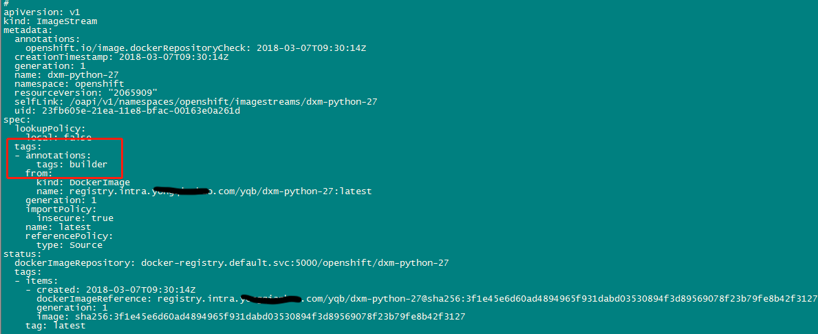 oc import-image registry.intra.XXXXXXXXX.com/yqb/dxm-python-27:latest -n openshift --confirm --insecure=true