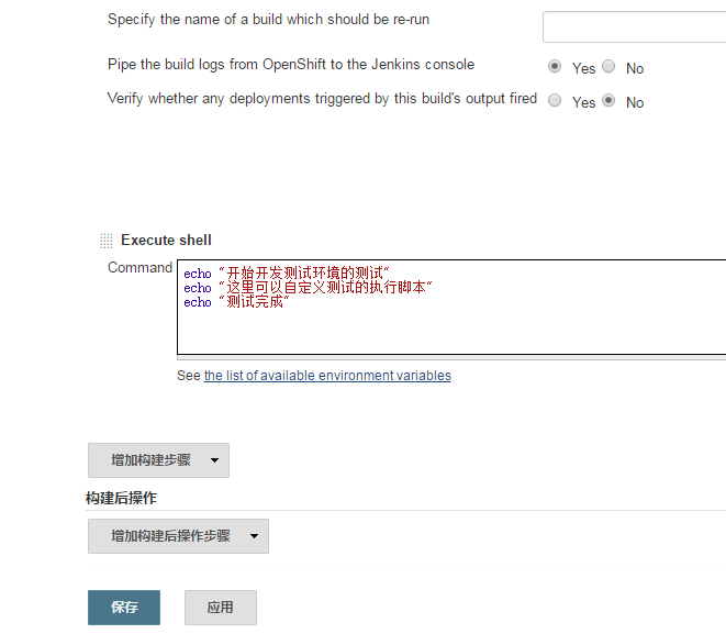 2、再次点击"Add build step"(增加构建步骤),类型为:Execute Shell,输入以下脚本。当上一个build step完成后,这个build step将被触发执行。用户可以在这个执行脚本加入自定义的逻辑,执行测试。