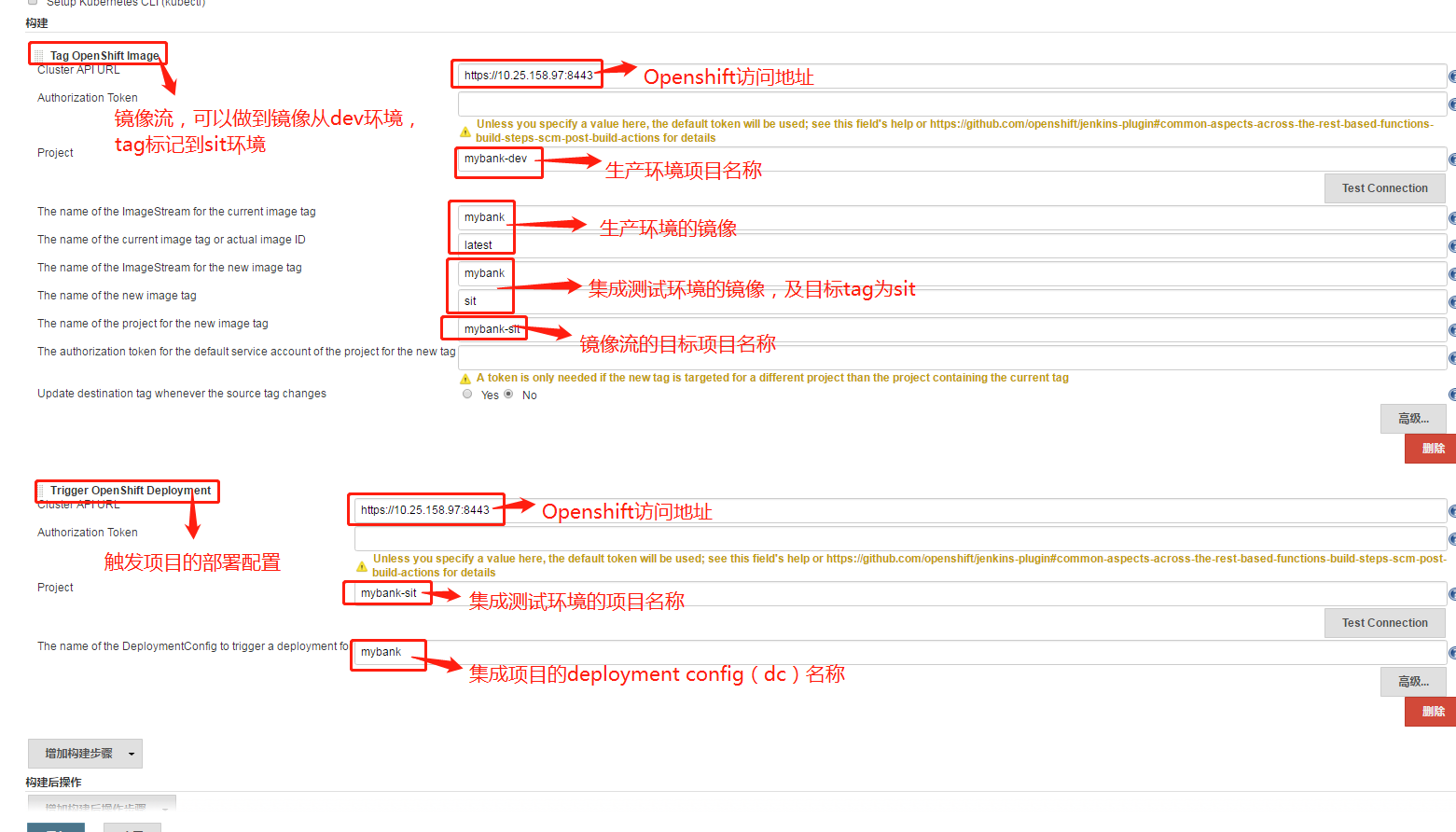1、创建MyBank SIT,类型:freestyle project,添加"Add build step",构建步骤,选择"Tag Openshift Image",然后再次点击添加"Add build step",构建步骤,选择"Trigger Openshift Deployment"