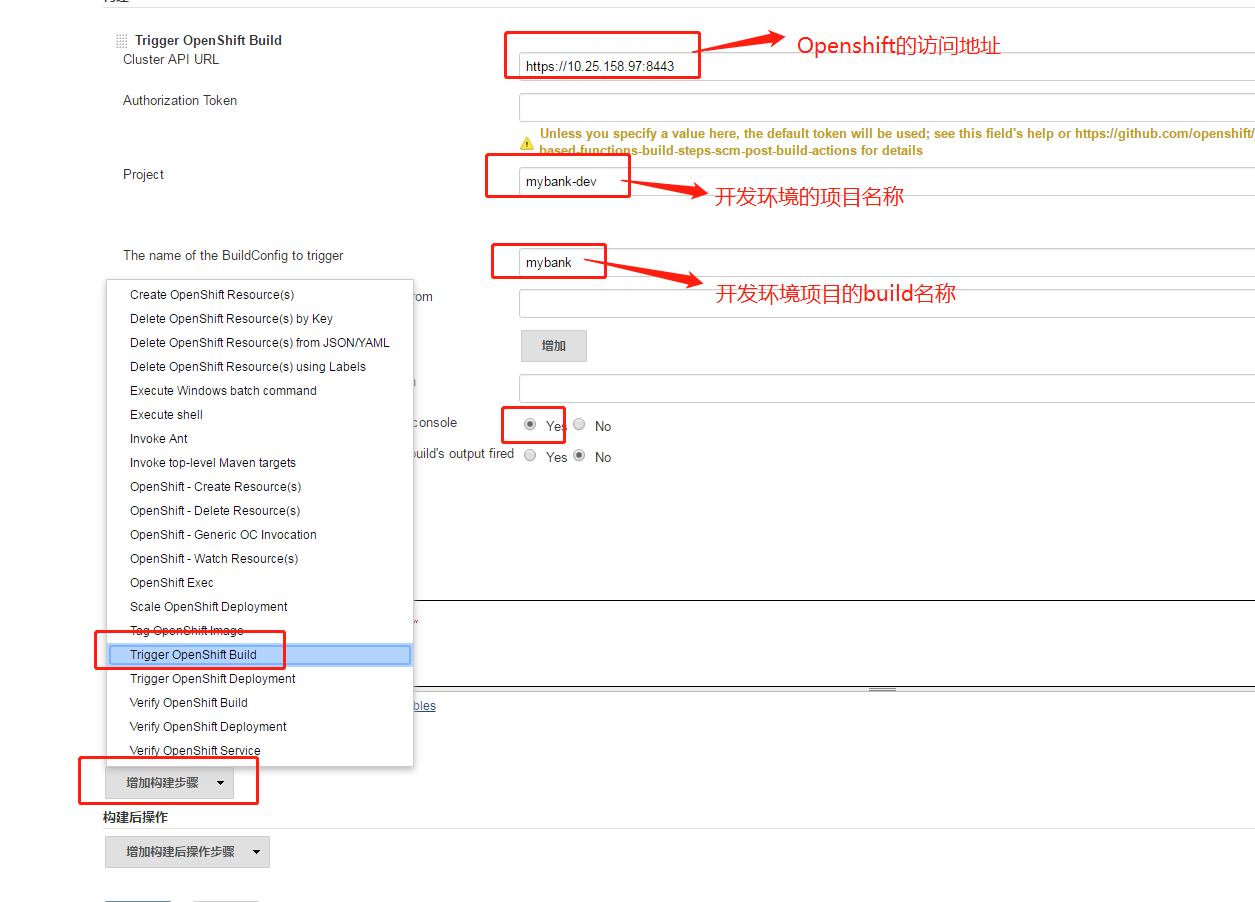 1、创建MyBank DEV,选择freestyle project,创建项目。跳转到配置页面,点击"Add build step"(增加构建步骤),类型选择:Trigger Openshift Build