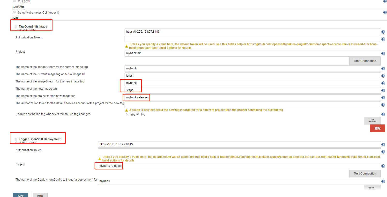 1、根据sit的方式,创建项目MyBank RELEASE,添加两个build step,分别是:tag openshift image和trigger openshift deployment。