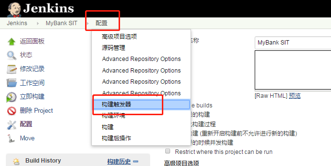 1、在jenkins首页,将鼠标移动到MyBank SIT项目,单击浮动菜单的configure链接进入配置修改页面。在build triggers配置组中勾选build after other projects are built,将Projects to watch的值设置为MyBank DEV,如图:
