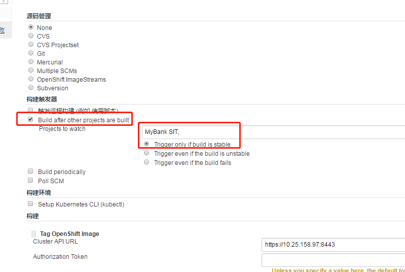 2、以同样的方式修改MyBank RELEASE项目的build triggers配置,将Projects to watch的值设置为MyBank SIT,保存。