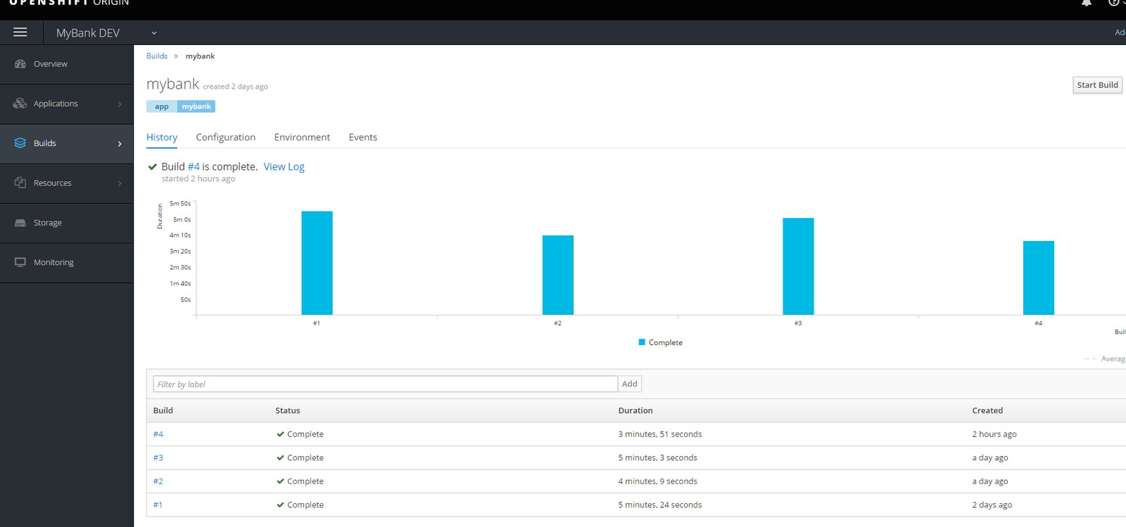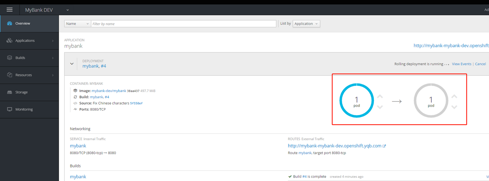 3、至此,一条完整的部署流水线完成构建,首先触发MyBank DEV项目的构建,注意观察openshift中各个项目的变化。