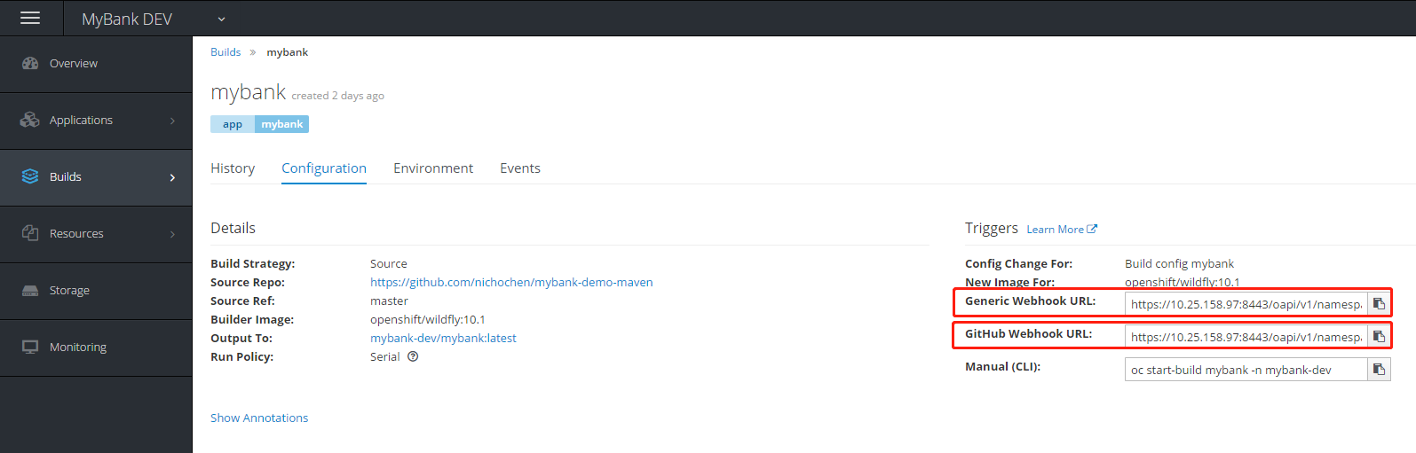 每个build config都定义了两个webhook触发器,一个是github webhook,一个是generic webhook。