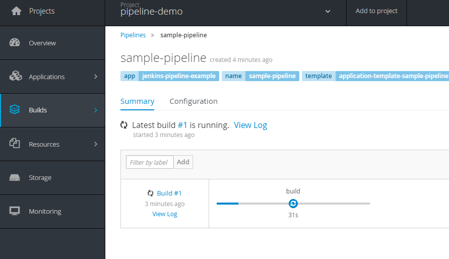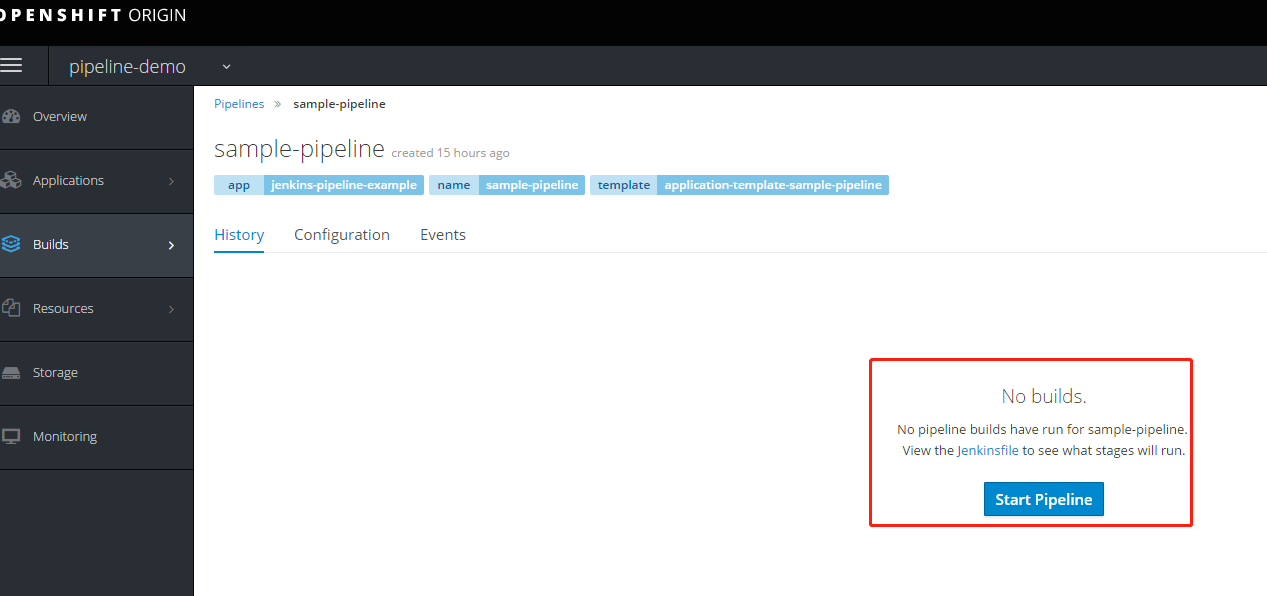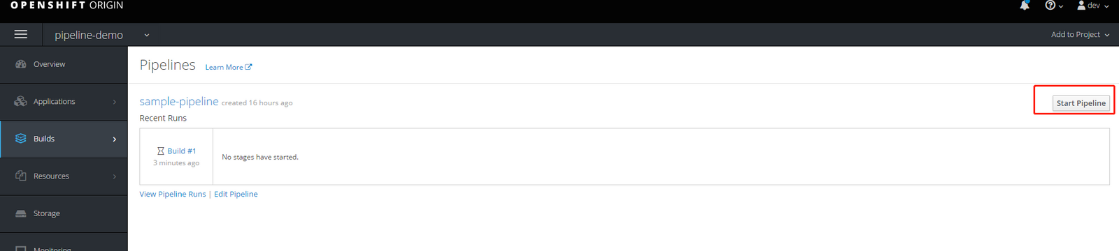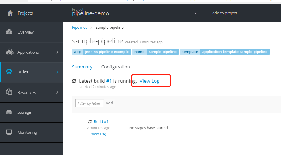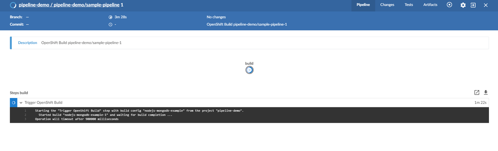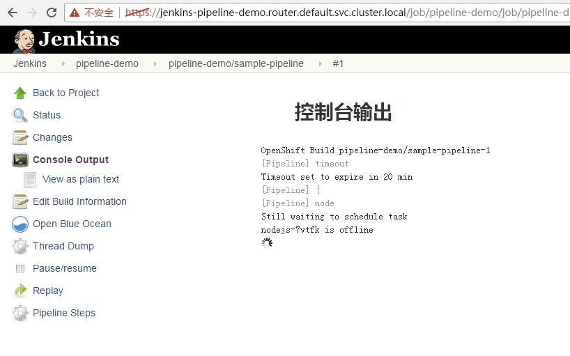 【openshift教程-05.3】【Openshift流水线-触发流水线构建】 Published by Connor Xu August 24th, 2019 通过openshift web控制台,点击"start pipeline"触发: 点击View Log,跳转到Jenkins的console页面 打开Jenkins的Open Blue Ocean Openshift