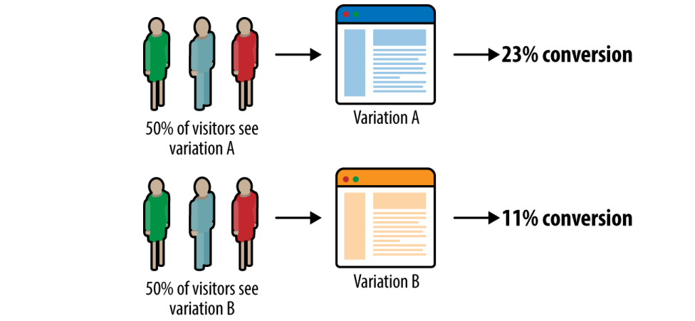 一个很好的例子就是向你的销售网站或移动应用程序的变更。你将流量的百分比引导到新版本,并测量其数量。按版本销售(按访问者数量计算的转化率)。然后,您可以转化率的变化,进行切回原来的应用,或者使用最新的应用。