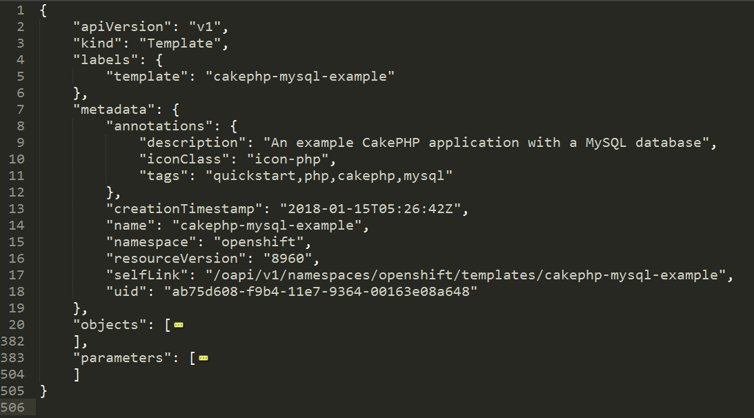 【openshift教程-09.2】【部署模板定制-元信息】 Published by Connor Xu August 24th, 2019 元信息(Metadata)是每个Kubernetes和OpenShift对象定义都具备的内容。元信息中记录了对象的名称、所属的命名空间、注解(Annotation)、版本及创建时间等信息。下面示例展示的是模板cakephp-mysql-example的元信息。 Openshift