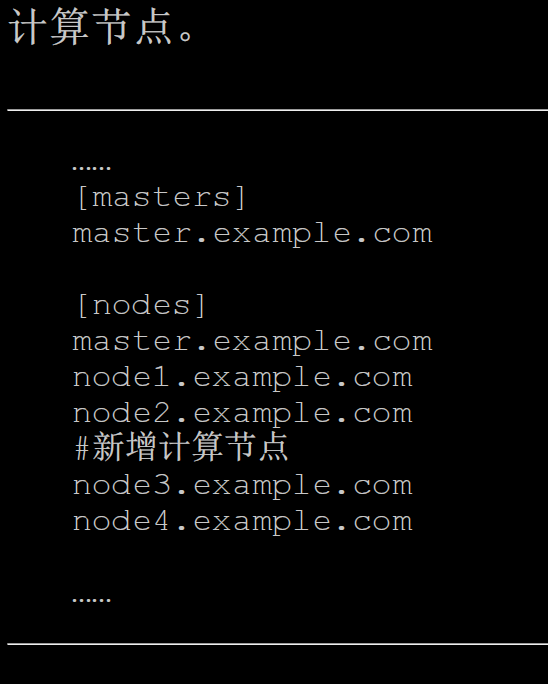 通过Ansible进行扩容需要编辑Ansible的Inventory,即/etc/ansible/hosts文件。在相应的角色下添加新节点的域名及配置信息。然后执行Ansible的Playbook实施具体的扩容动作。